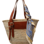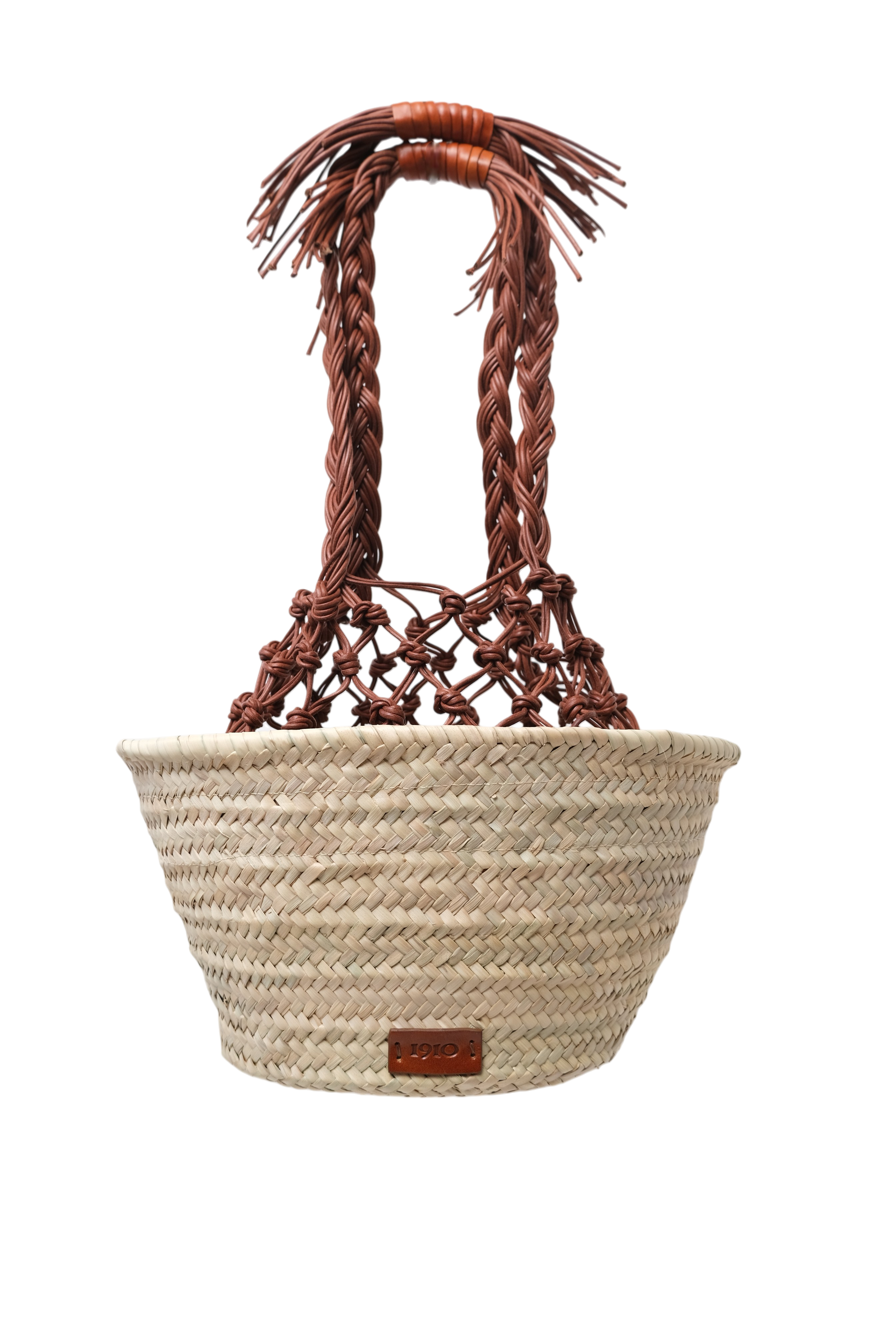 Cesta in palma con manici e rete in cotone intrecciati a mano,dettagli in pelle