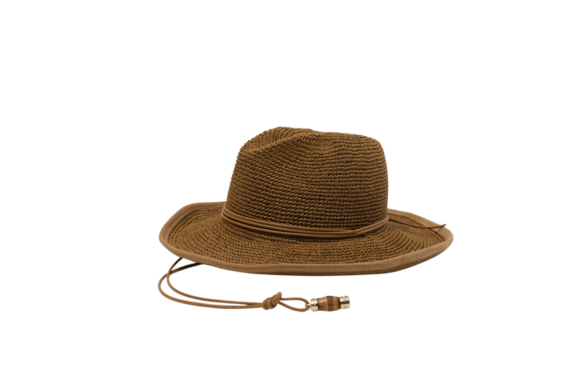 Ranger in carta crochet con tesa rialzata bordata in camoscio,cinturino e lacci sottogola in cotone, chiusura in bambù e dettagli in camoscio