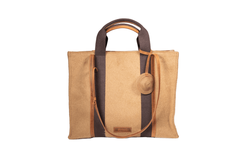 Tote bag grande in mohair con manici in cotone, tracolla regolabile in pelle invecchiata, dotata di tasca interna e charm cappello.
