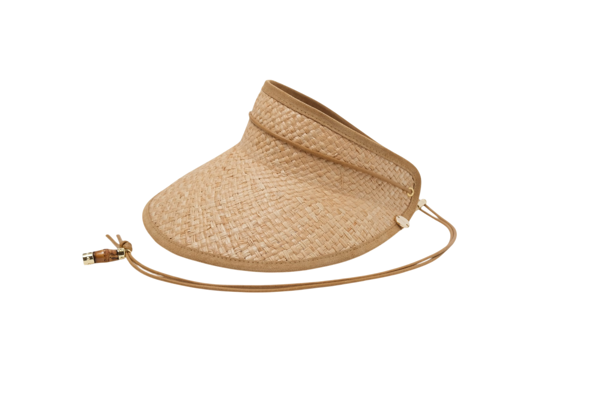 Visiera in raffia con bordo in camoscio, cordino regolatore incotone, chiusura in bambù e placchetta oro