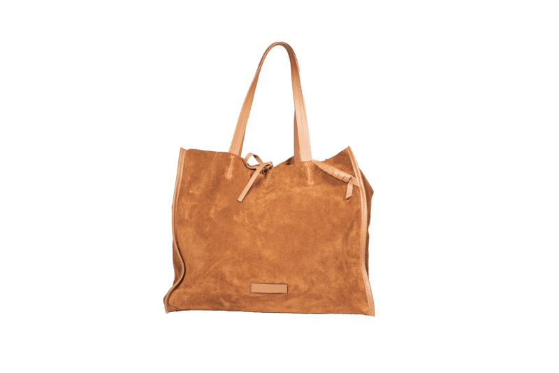 Tote bag in camoscio con profili e manici in pelle, dotata di pochette interna estraibile con dettaglio logo applicato a mano.
