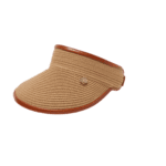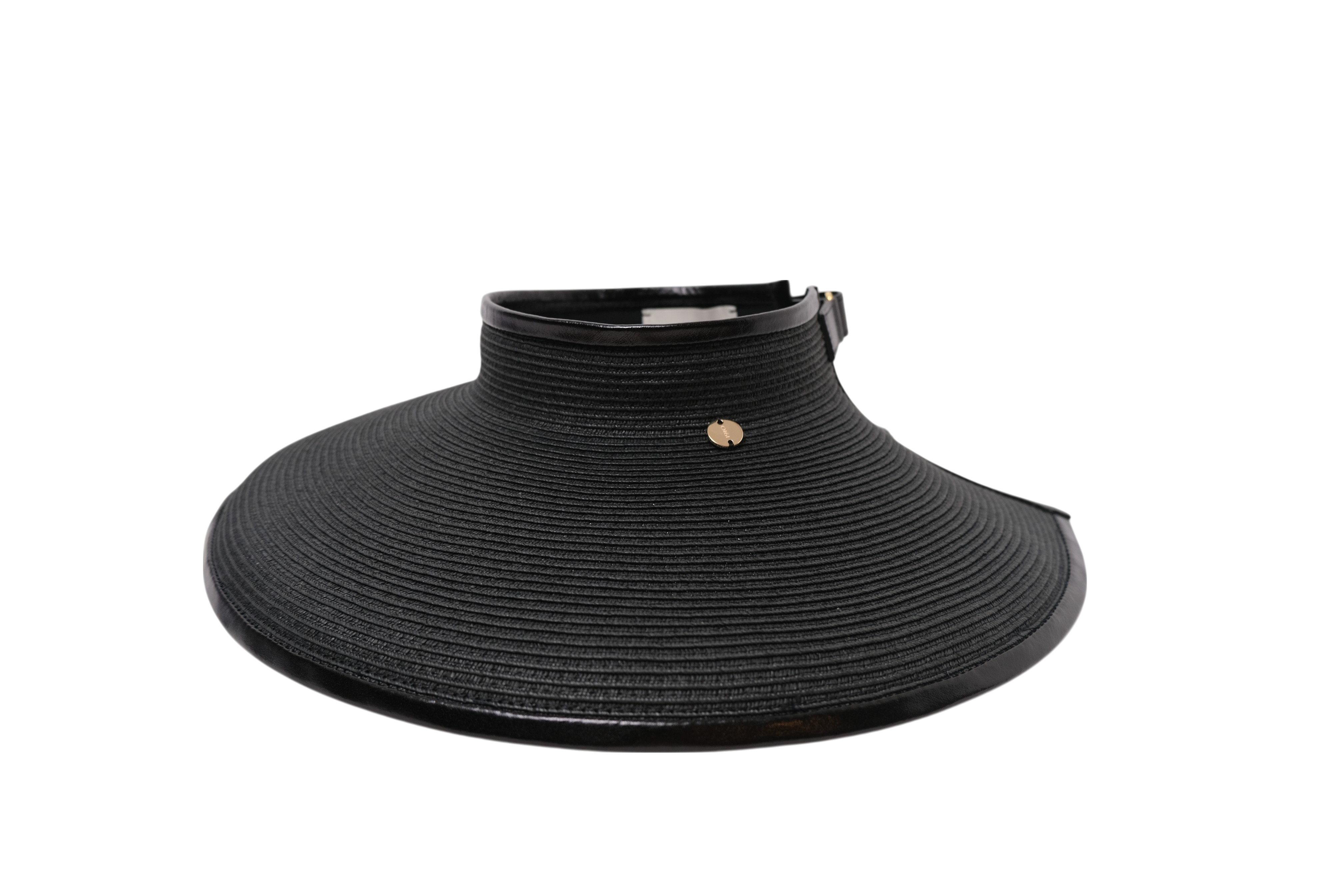 Maxi visiera in carta cucita con bordo, cinturino regolabile in pelle e placchetta oro