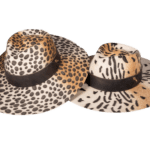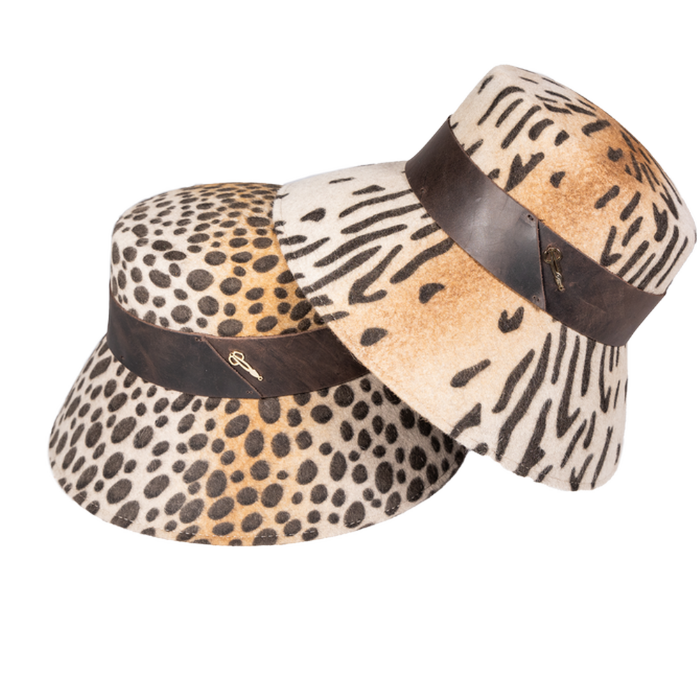 Cloche in taupé maculato con fascia in pelle invecchiata e dettaglio logo applicato a mano.