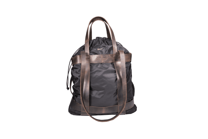 Shopper in nylon imbottito con gabbia, manici in pelle invecchiata e dettaglio logo applicato a mano.