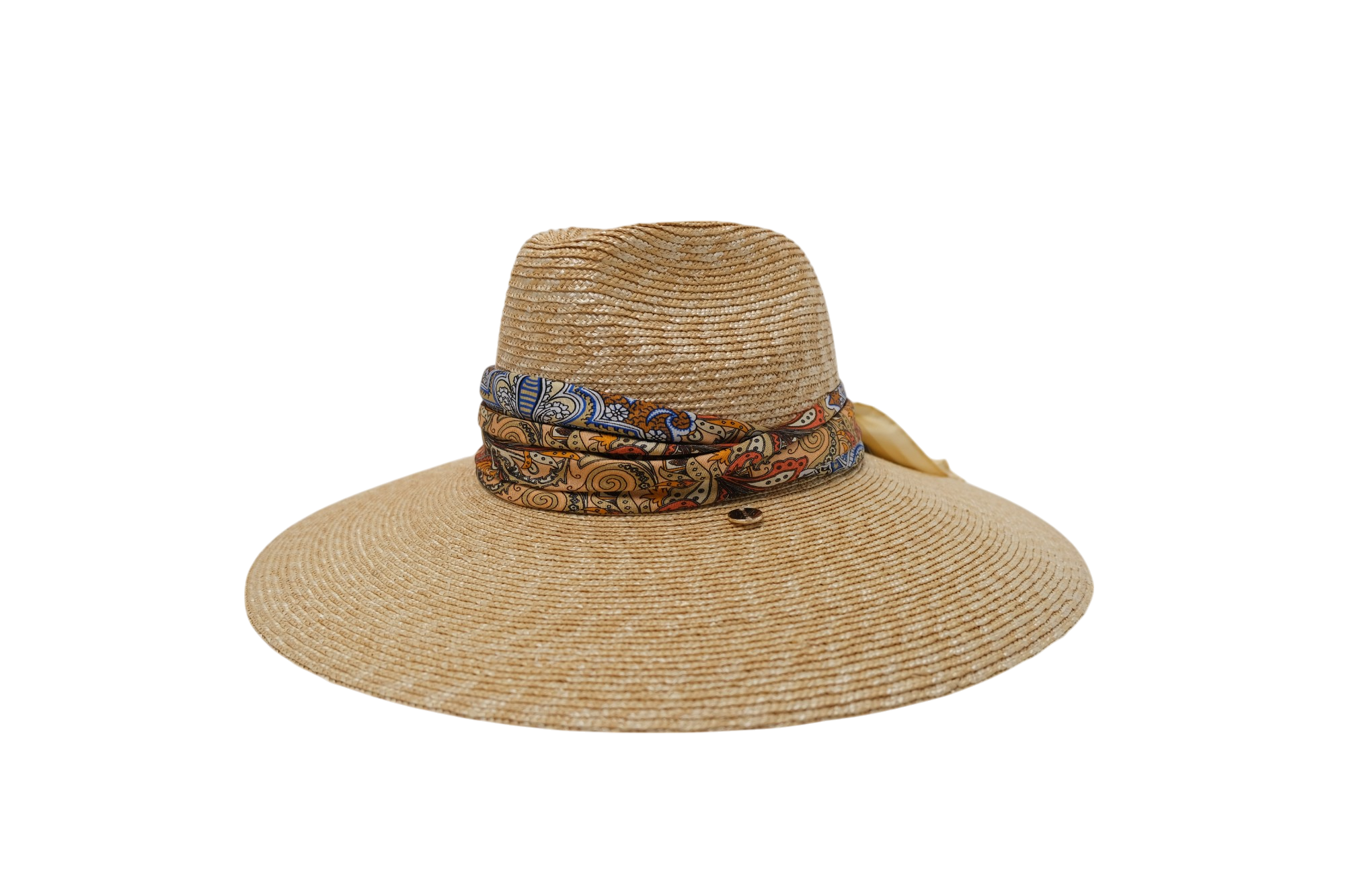 Ampia fedora in treccia di paglia fine con foulard in seta e placchetta oro