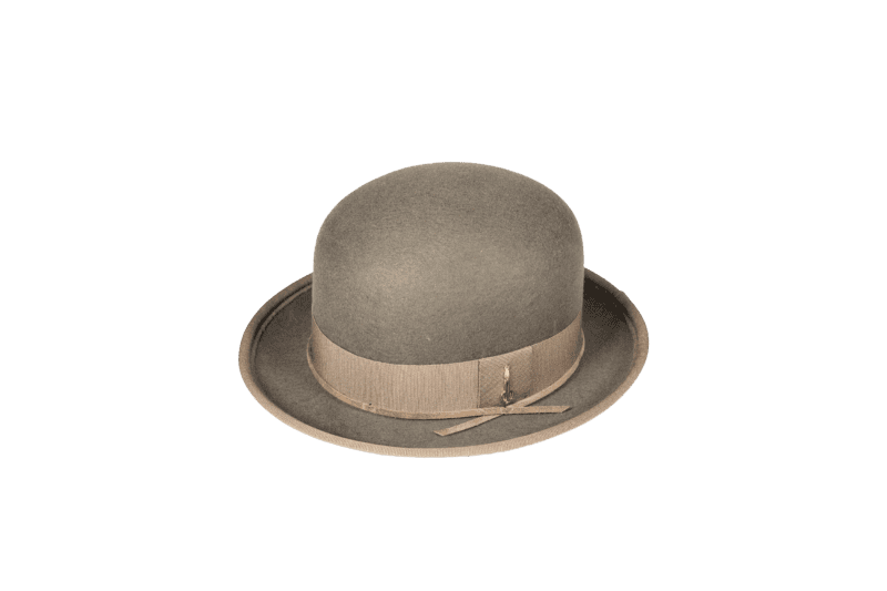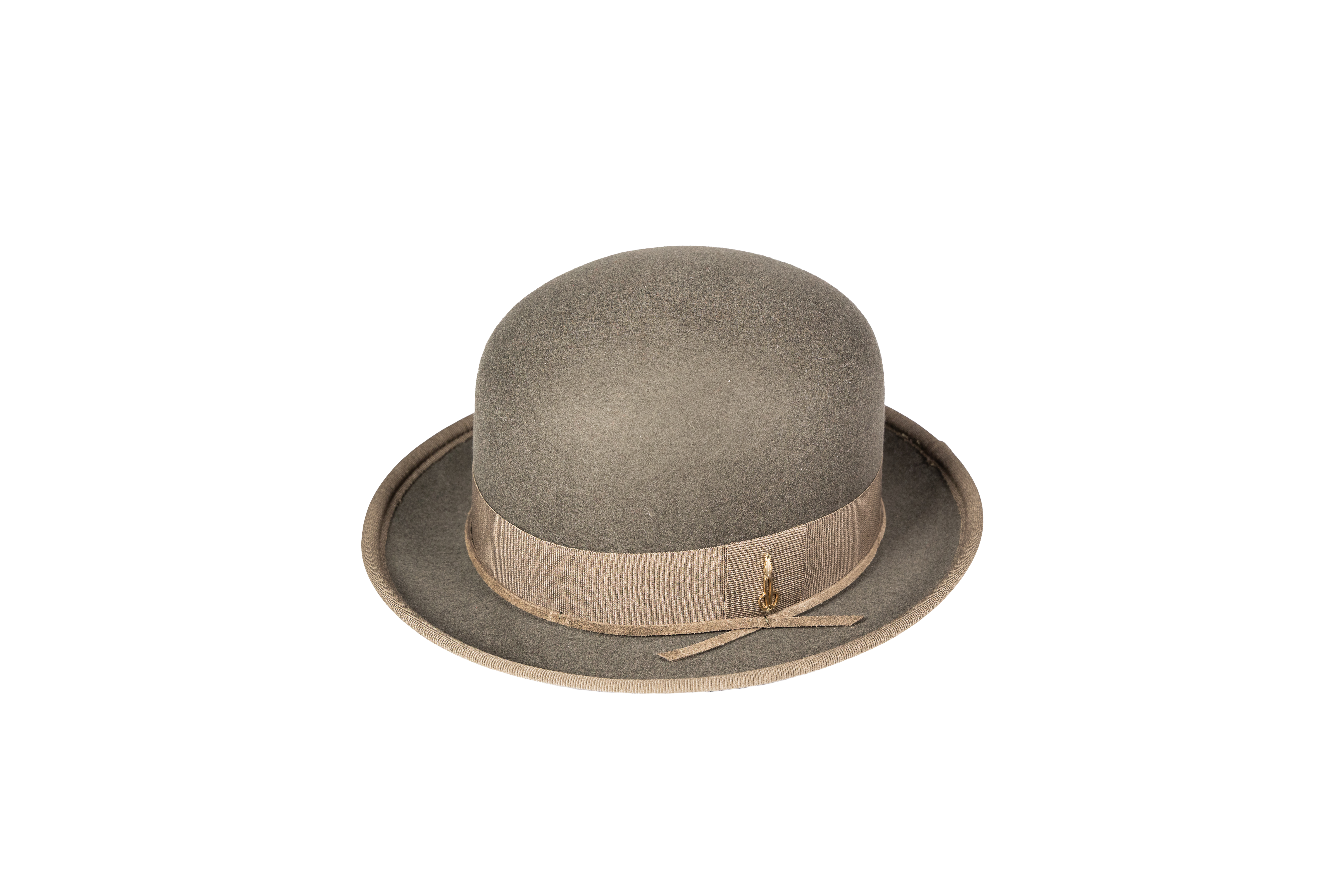 Bombetta in lana merino melange bordata con nastro con passante, cinturino in camox e dettaglio logo applicato a mano.