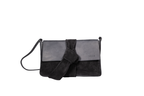 Pochette in pelle invecchiata e camoscio con tracolla regolabile, chiusura con nodo, dotata di tasca interna con dettaglio logo applicato a mano.