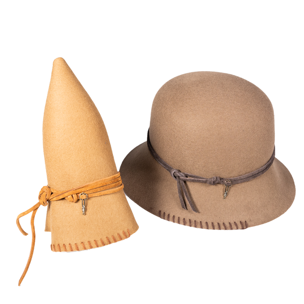 Cloche pieghevole in lana merino con cinturino in camox, ricamo sulla tesa e dettaglio logo applicato a mano.