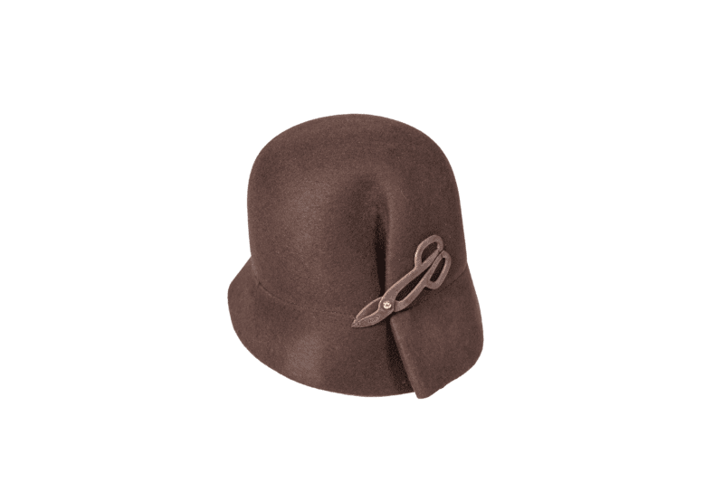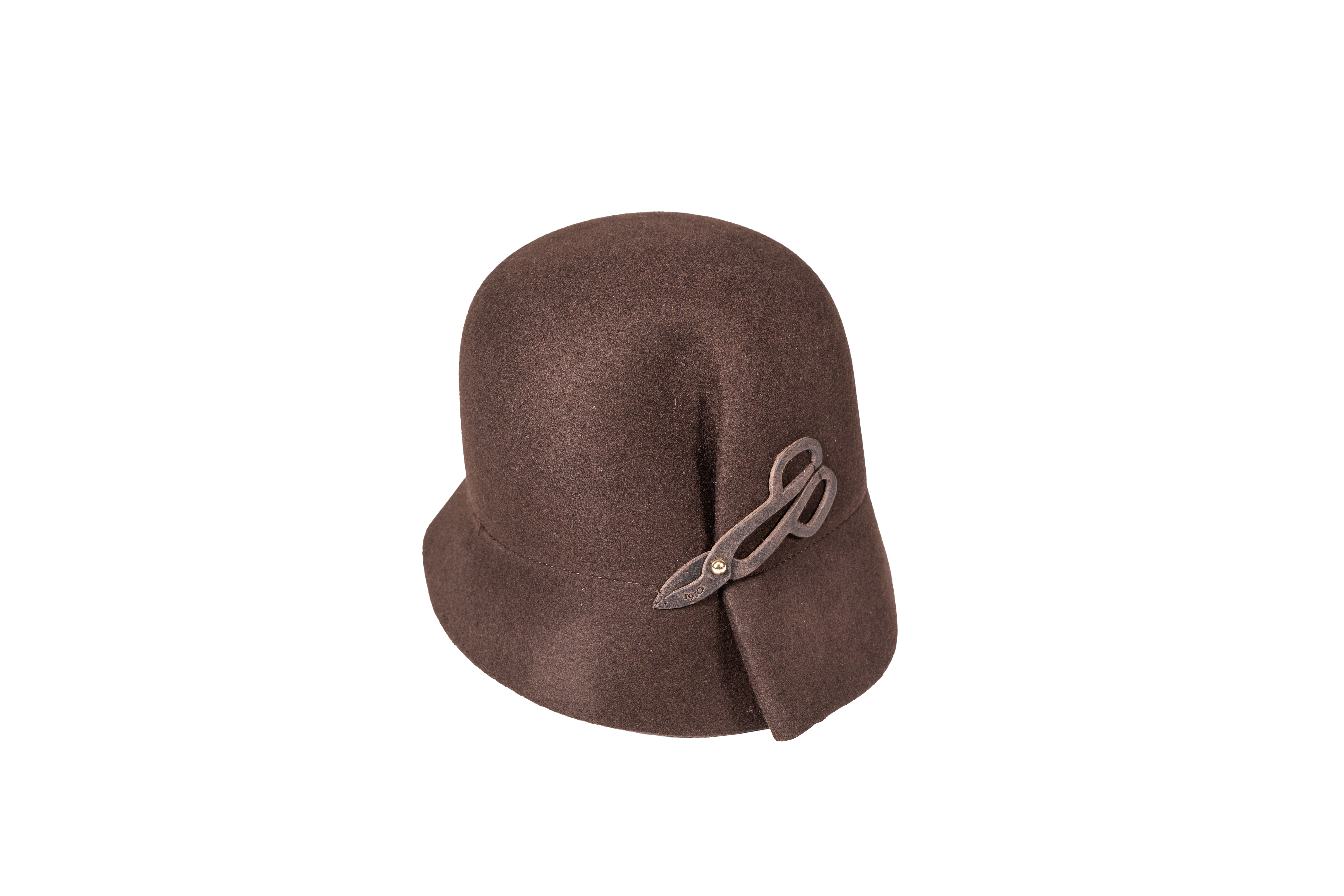 Cloche in lana merino con piega e dettaglio forbici in pelle invecchiata.