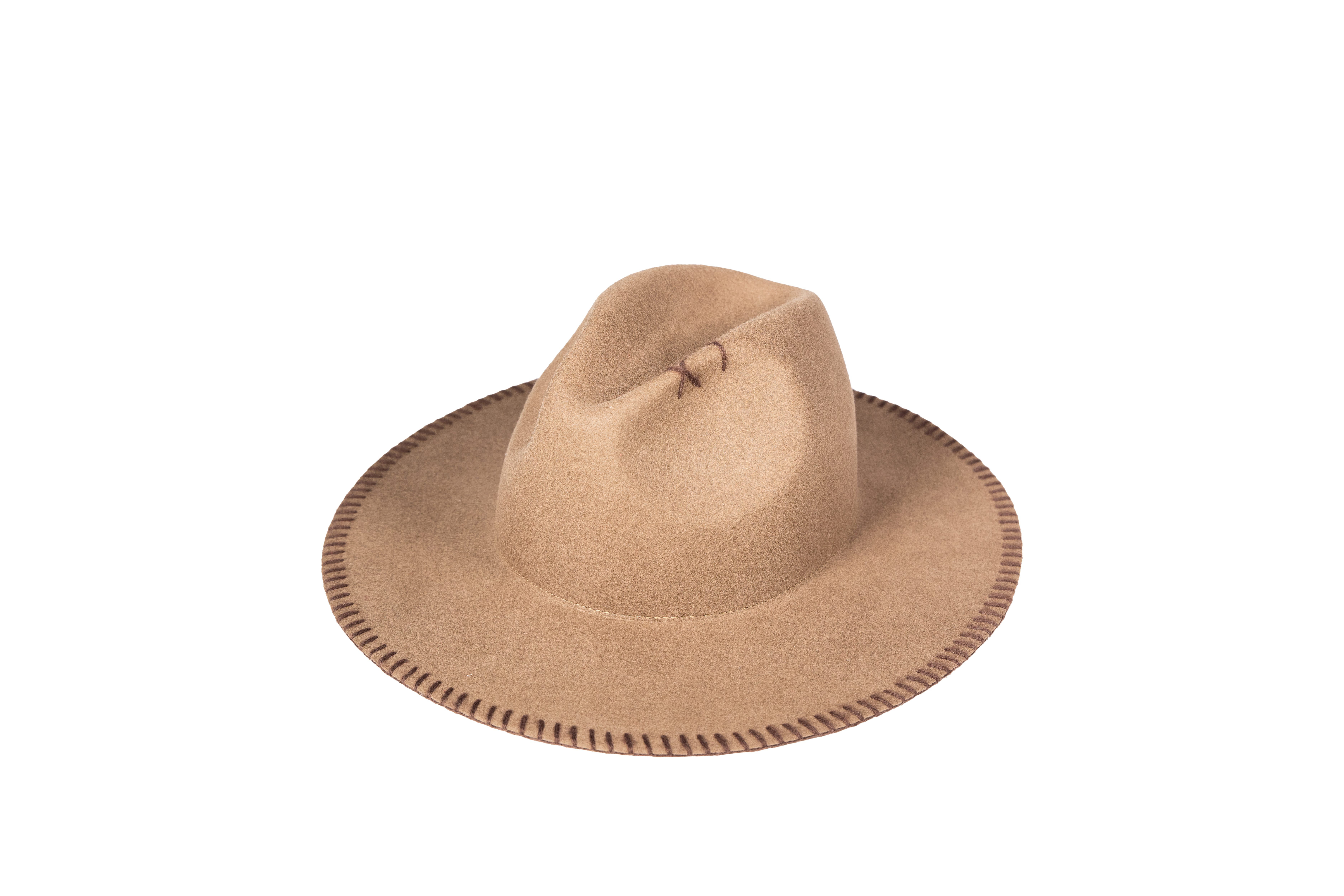 Fedora in lana merino con tesa impunturata, ricamo in lana e dettaglio logo applicato a mano.