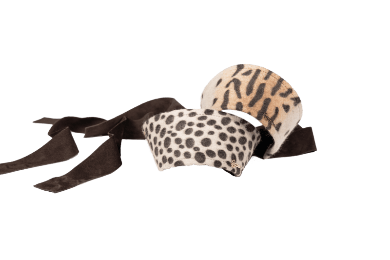 Fascia in taupé maculato con chiusura elastica, code in camox e dettaglio logo applicato a mano.