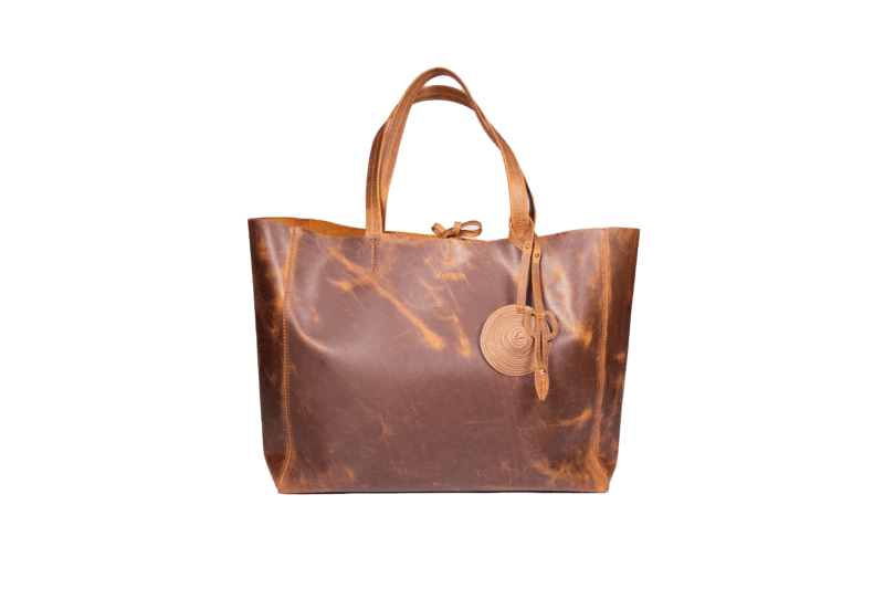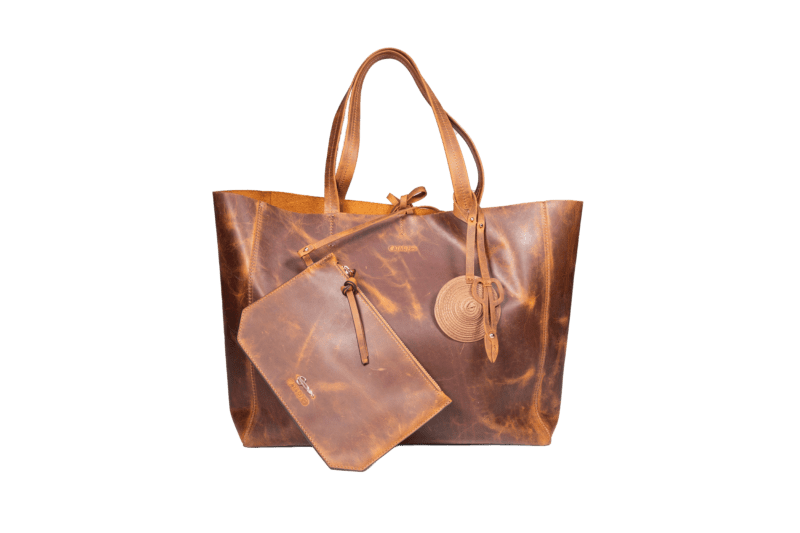 Tote bag in pelle invecchiata con manici a spalla, dotata di pochette interna estraibile con dettaglio logo applicato a mano, charms forbici e cappello.