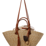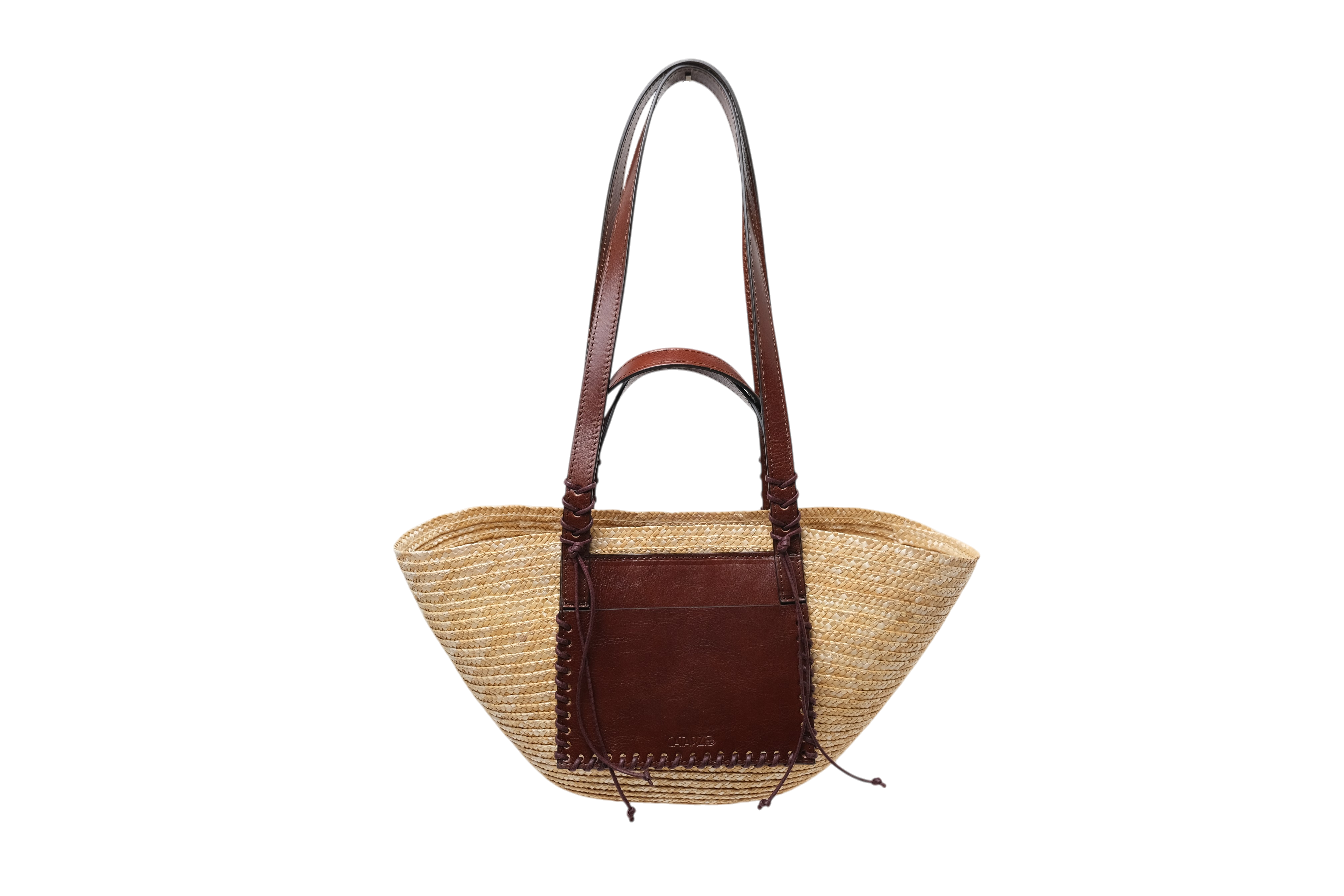 Borsa media in treccia di paglia con doppi manici in pelle, tasca in pelle con punto cavallo e lacci in cotone applicati a mano