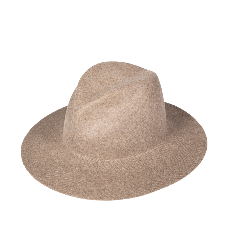 Fedora in lana merino melange con tesa a intarsio ed etichetta logo in pelle invecchiata.