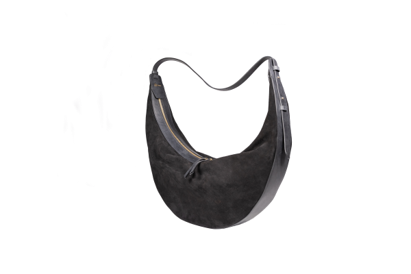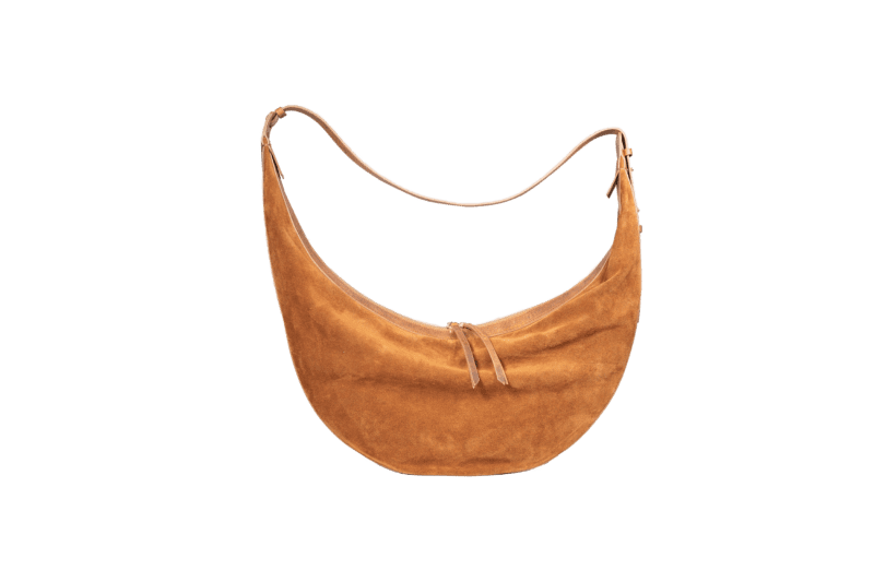 Sacca in pelle invecchiata e camoscio con tracolla regolabile e dettaglio logo applicato a mano.